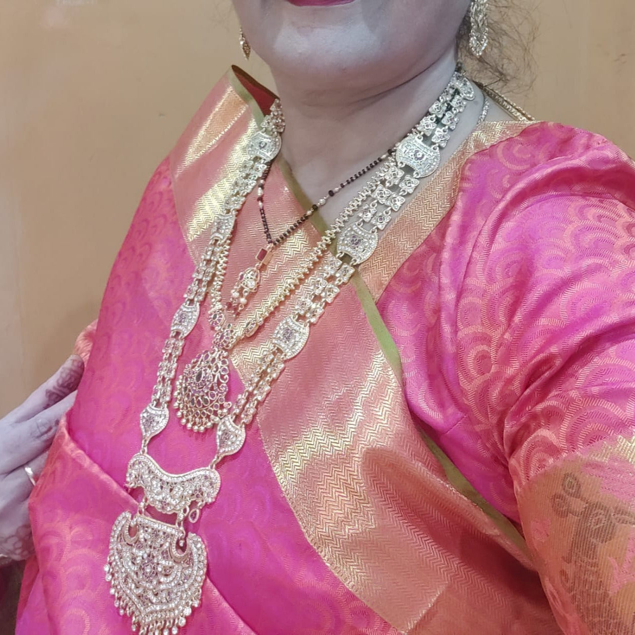Wanted to wear light weight necklace with her subtle pink lehanga on
