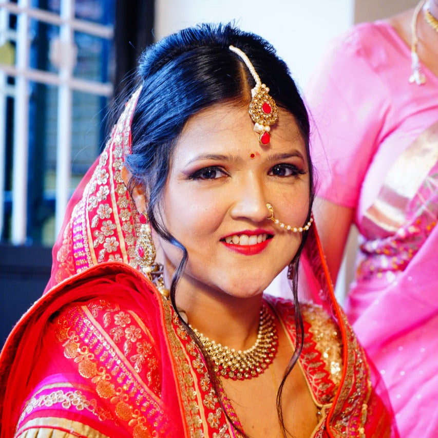 Aditi—a brilliant maths tutor, creative content writer, and soulful plant lover—made her wedding truly one-of-a-kind with our handcrafted Bindhani nath. the size , length and shape of nath were customized for her keeping her comfort and facecut in mind.
