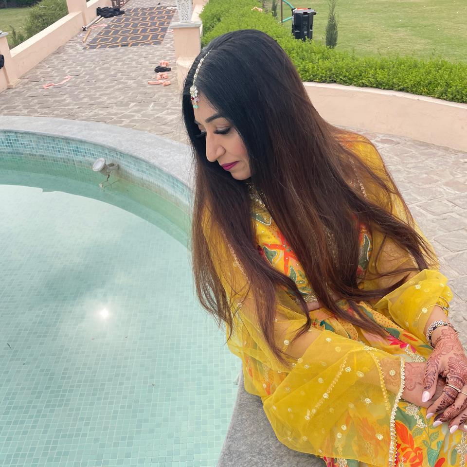 Neelam has Channeled her inner divine soul with our exquisite Bindhani Tika designs. Perfect for the dance-loving Punjabi girl like her to flaunt in haldi function in Rajasthan Udaipur at a royal Punjabi wedding.