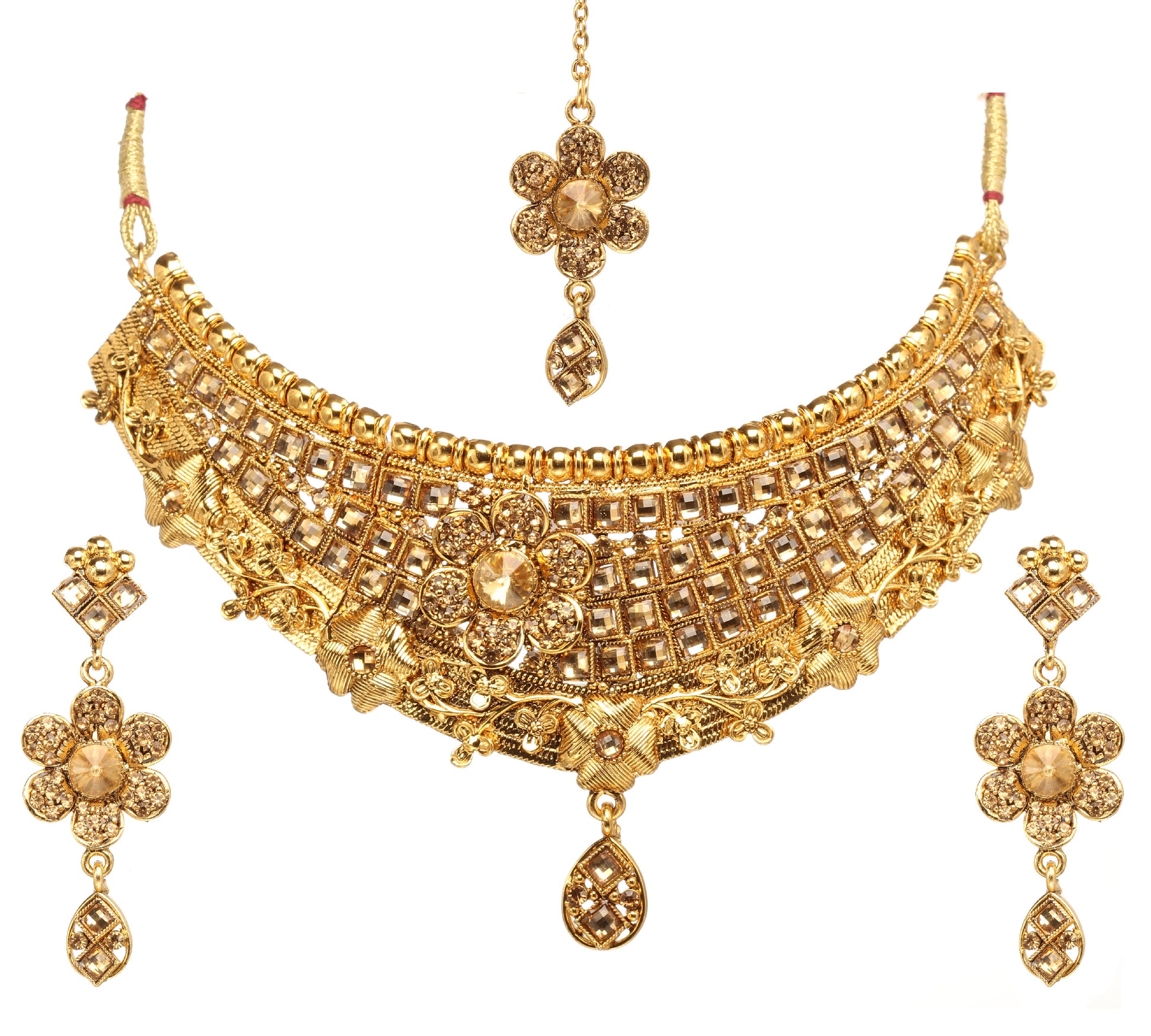 Indian customers have a preference for various necklace styles, including simple pearl necklace malas, choker necklaces with earrings, and complete jewelry sets comprising earrings, necklaces, and mangtikkas. In Hindi, a necklace set is also referred to as "gale ka necklace," and in Rajasthan, Rakhdi sets are popular, especially with Rajputi dresses. Additionally, multilayered Rani Haar or Haram, Jaipuri Kundan necklaces with Jhumka sets, and in certain regions, chokers are known as Haslis. South Indian customers often favor multilayered temple necklace sets. For bridal wear, a complete packet of Dulhan sets is