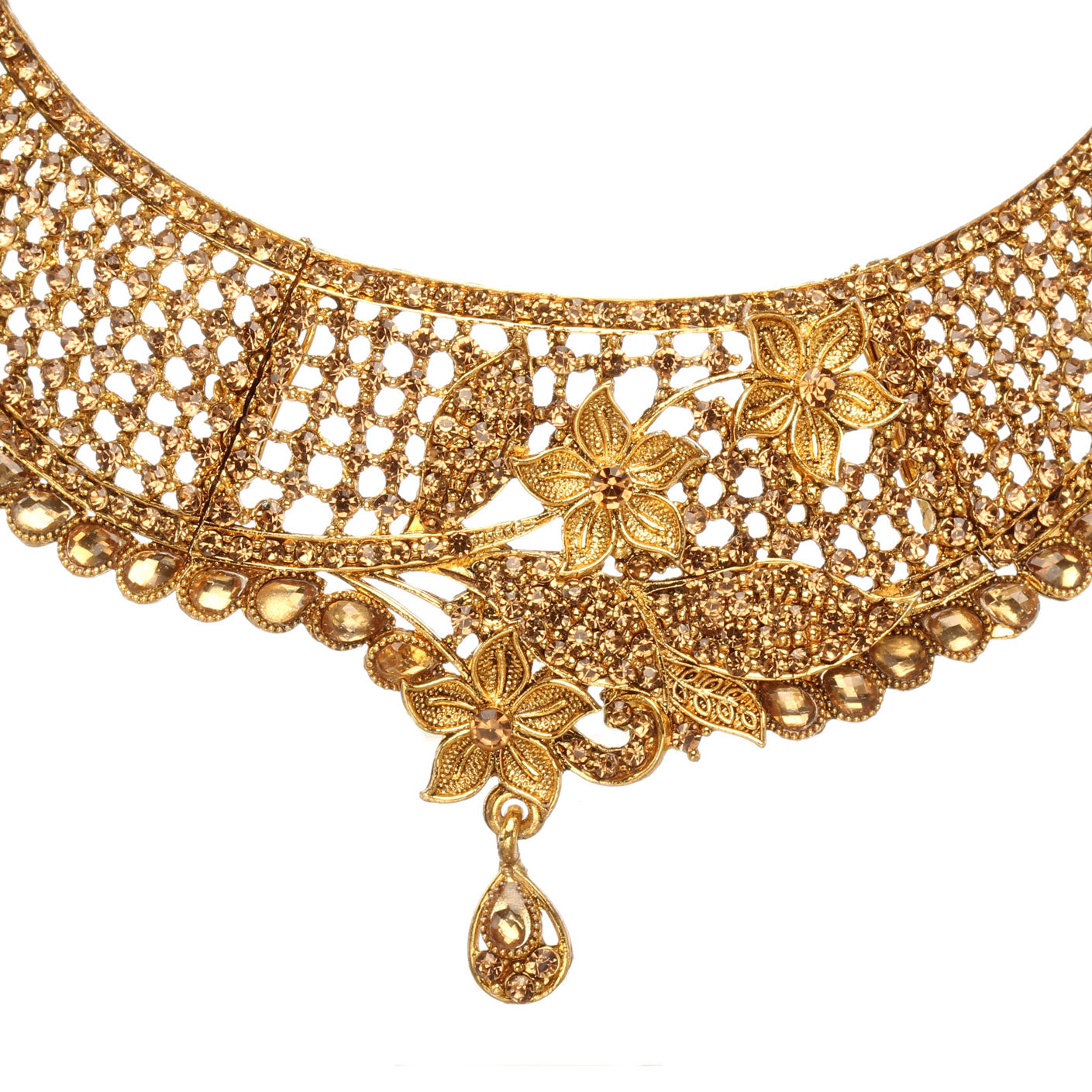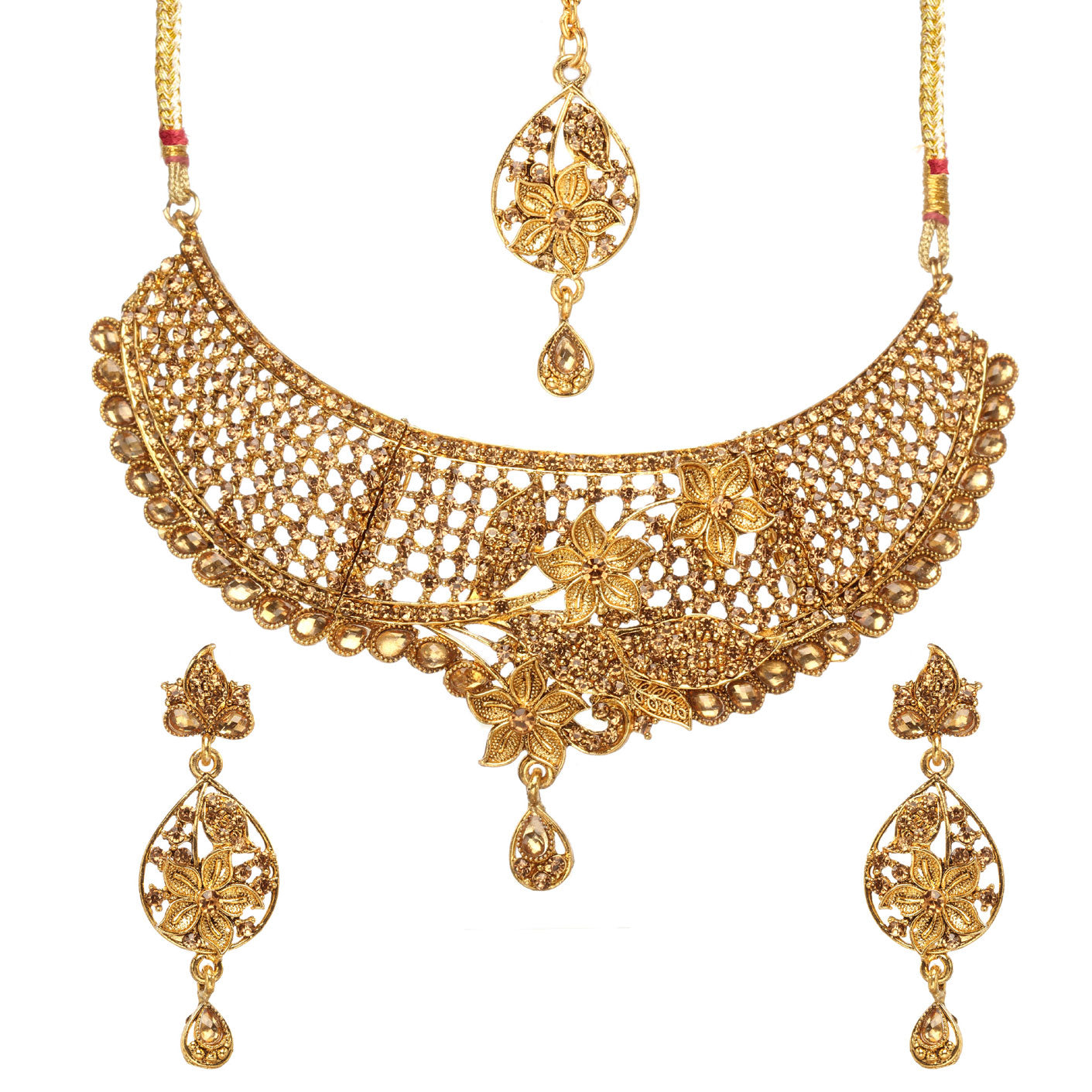 Indian customers have a preference for various necklace styles, including simple pearl necklace malas, choker necklaces with earrings, and complete jewelry sets comprising earrings, necklaces, and mangtikkas. In Hindi, a necklace set is also referred to as "gale ka necklace," and in Rajasthan, Rakhdi sets are popular, especially with Rajputi dresses. Additionally, multilayered Rani Haar or Haram, Jaipuri Kundan necklaces with Jhumka sets, and in certain regions, chokers are known as Haslis. South Indian customers often favor multilayered temple necklace sets. For bridal wear, a complete packet of Dulhan sets is