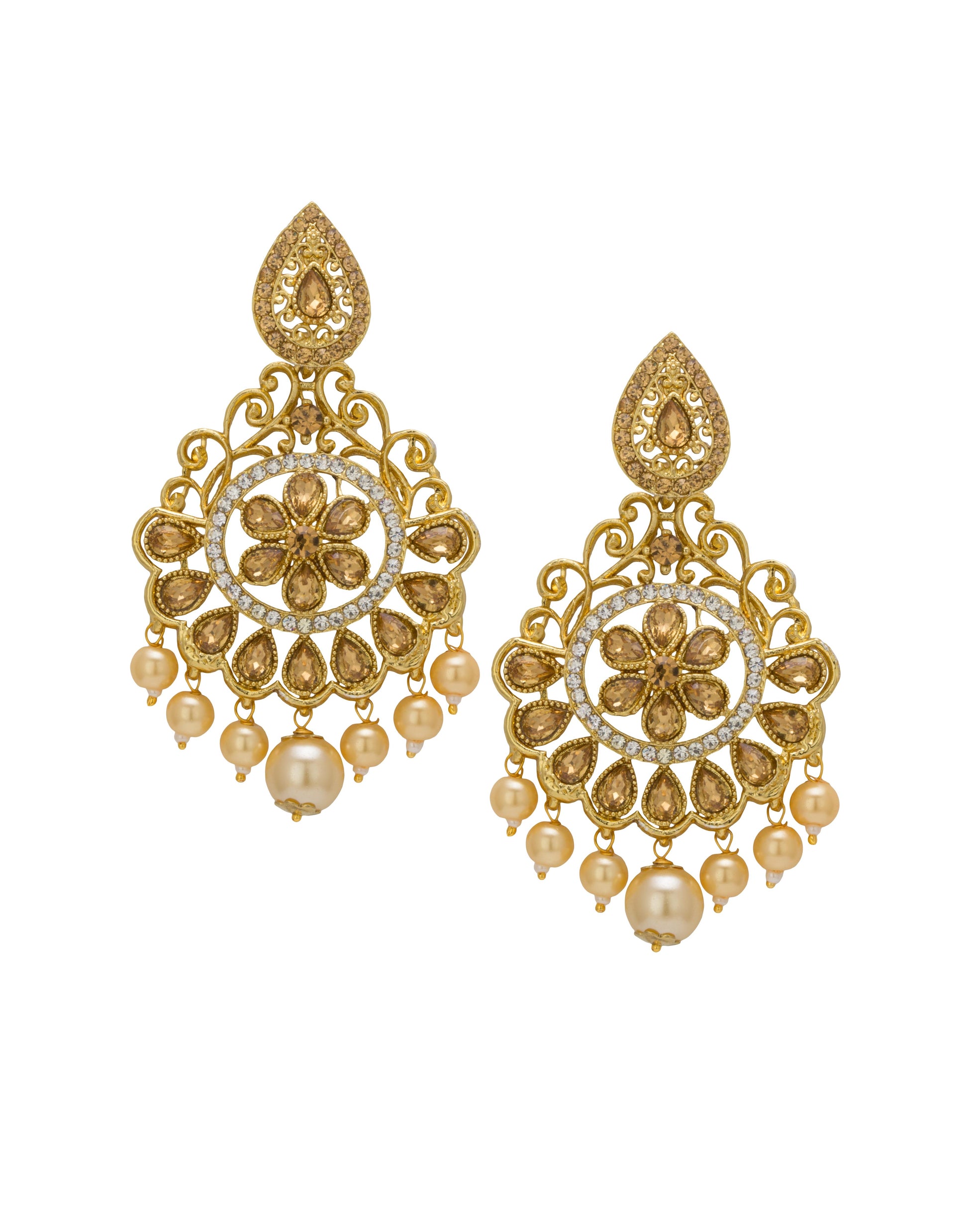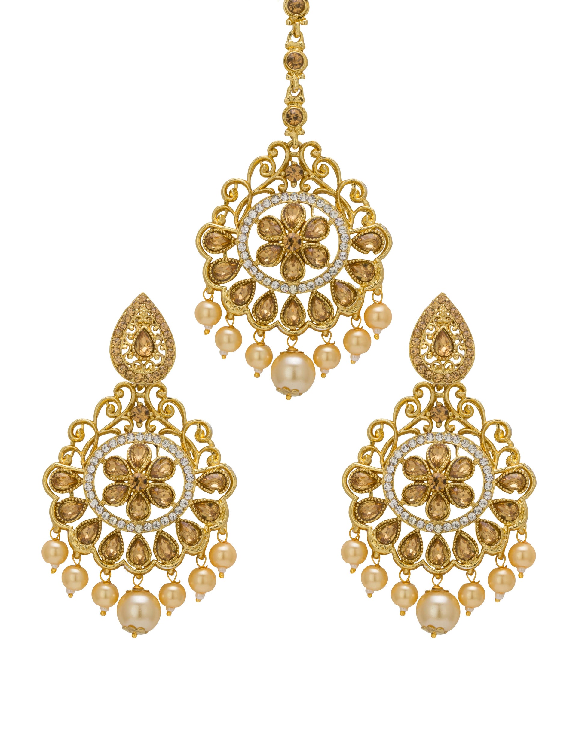Complete your traditional look with ease with this Earrings With Maang Tikka Set from Bindhani. Featuring golden pearls and white CZ stones, this set adds a touch of elegance and weightlessness to your ensemble. The medium size is perfect for any occasion.