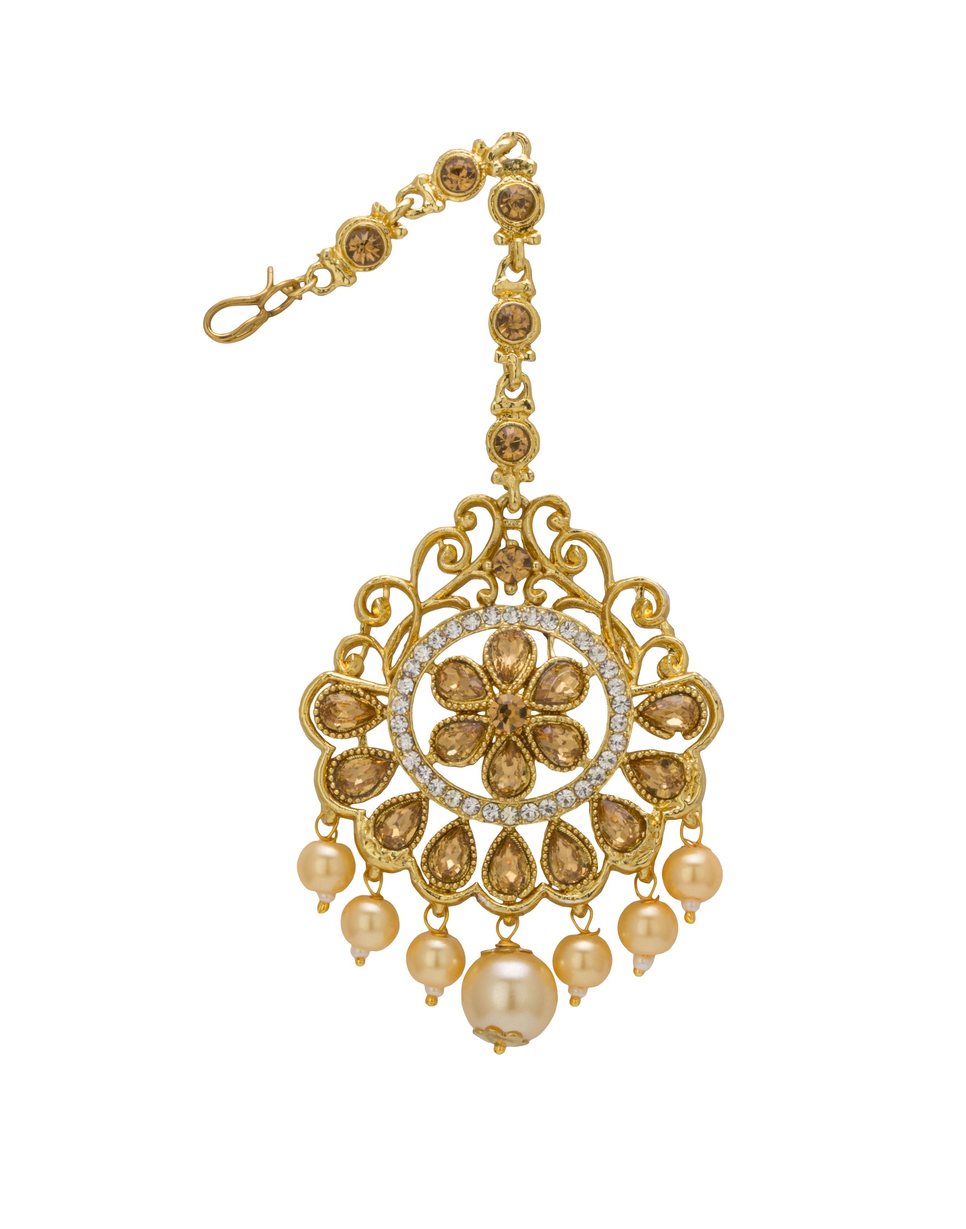 Maang tikka jewellery is crafted using a variety of materials, including: Gold-plated & silver-plated on alloy zinc, brass,copper metal. Kundan stones, Pearls etc.