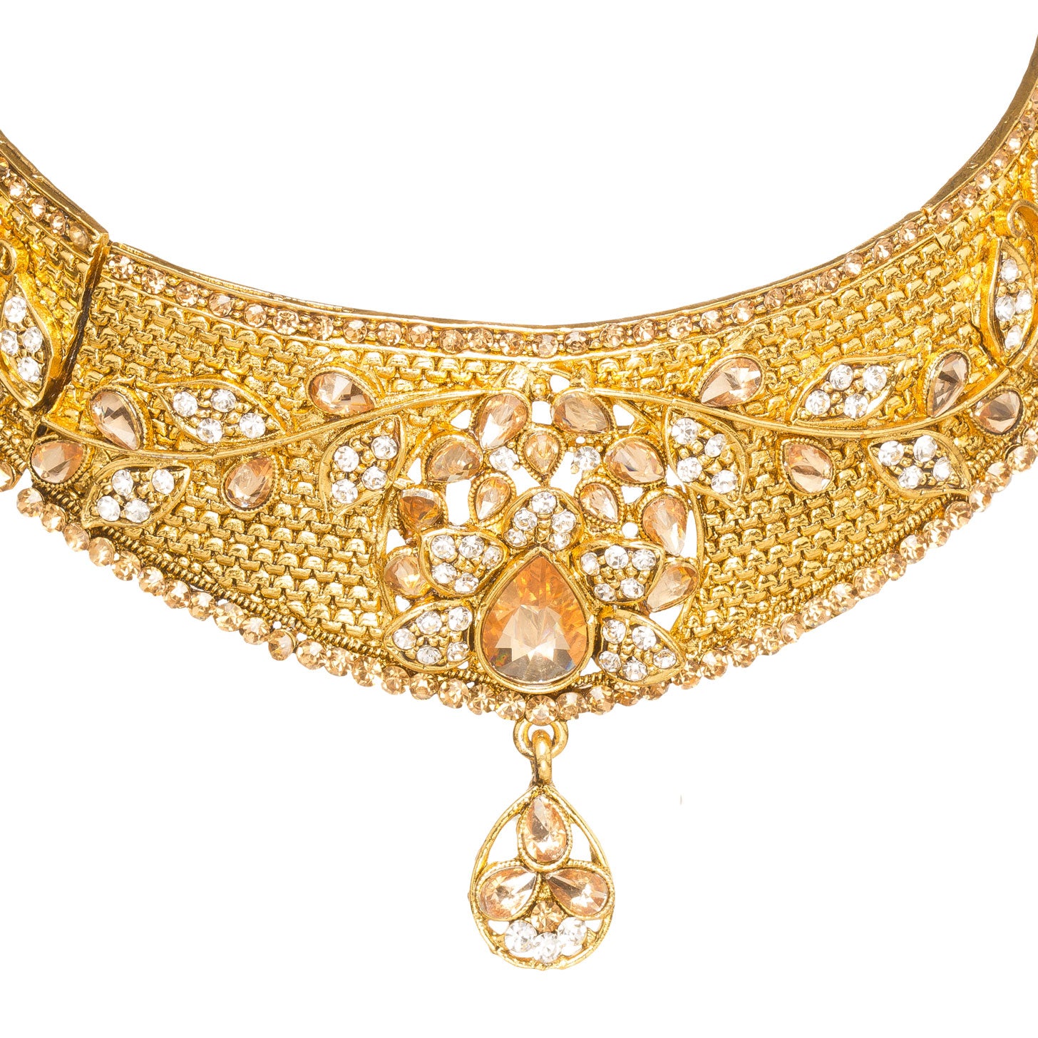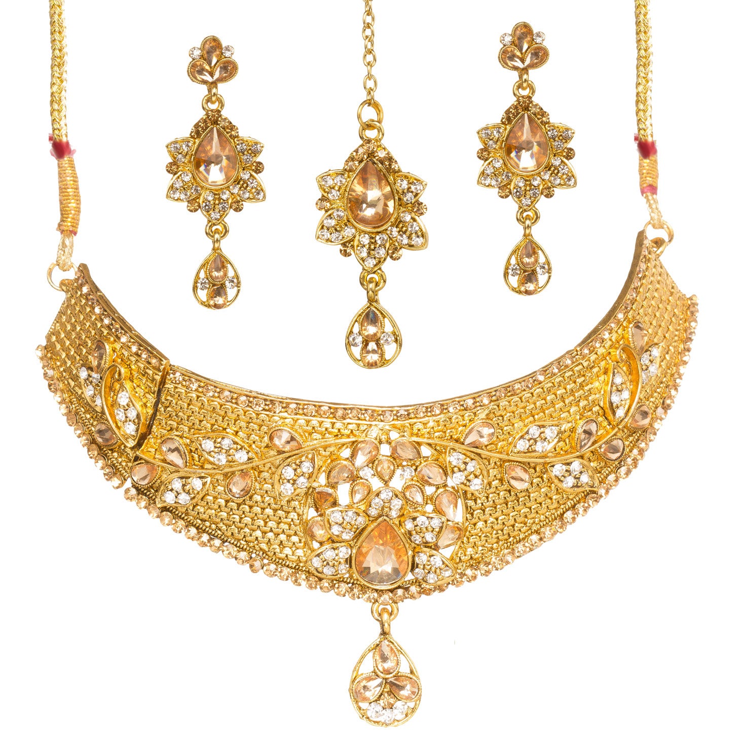 Indian customers have a preference for various necklace styles, including simple pearl necklace malas, choker necklaces with earrings, and complete jewelry sets comprising earrings, necklaces, and mangtikkas. In Hindi, a necklace set is also referred to as "gale ka necklace," and in Rajasthan, Rakhdi sets are popular, especially with Rajputi dresses. Additionally, multilayered Rani Haar or Haram, Jaipuri Kundan necklaces with Jhumka sets, and in certain regions, chokers are known as Haslis. South Indian customers often favor multilayered temple necklace sets. For bridal wear, a complete packet of Dulhan sets is