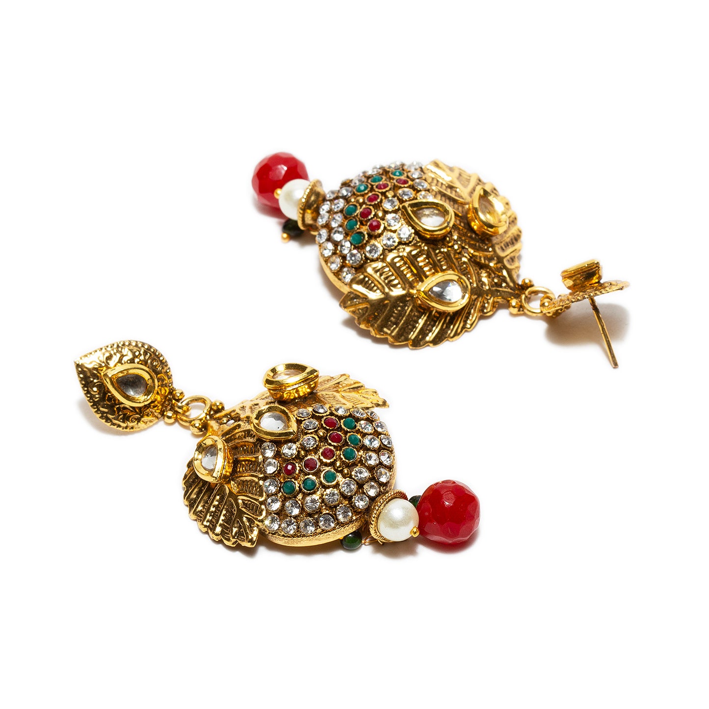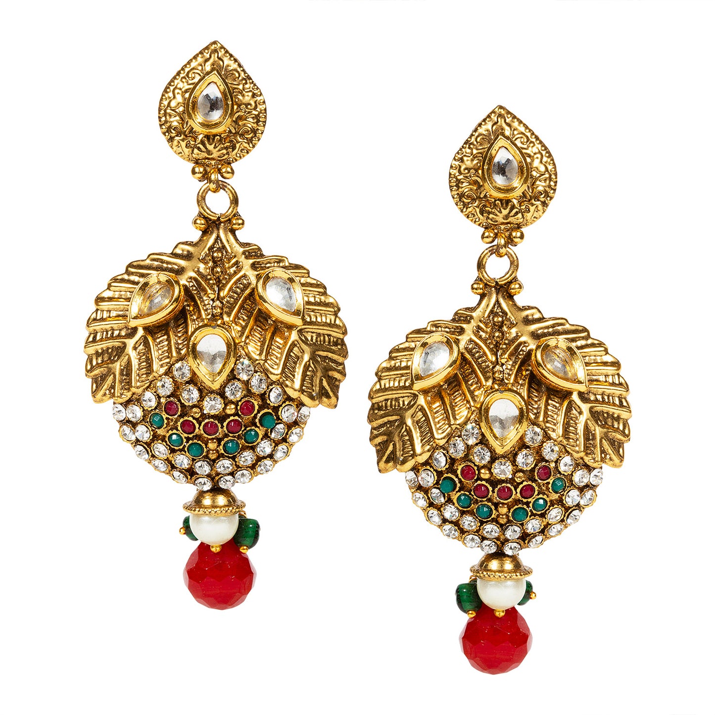Little distinctive style, design , luster and pattern. This antique gold plated triplet leaf motif, emerging kundan in it , peeped pearl all together makes this pair standalone in crowd. Secure with post and back lock.
