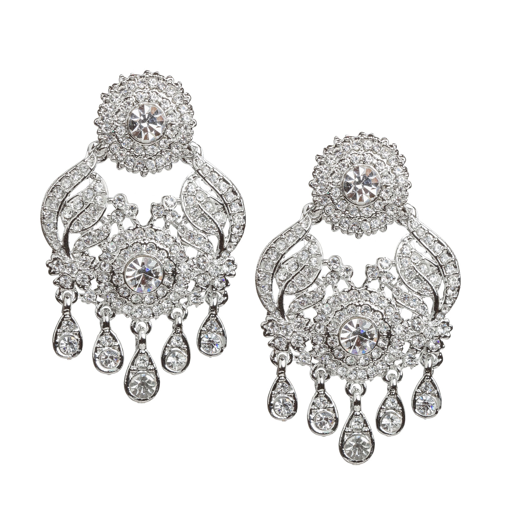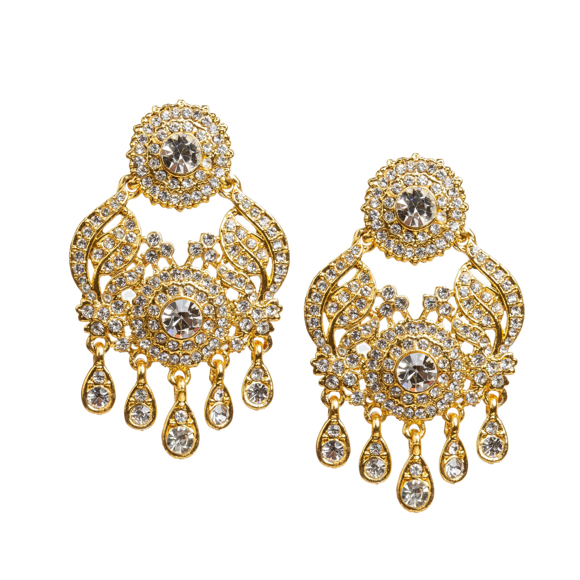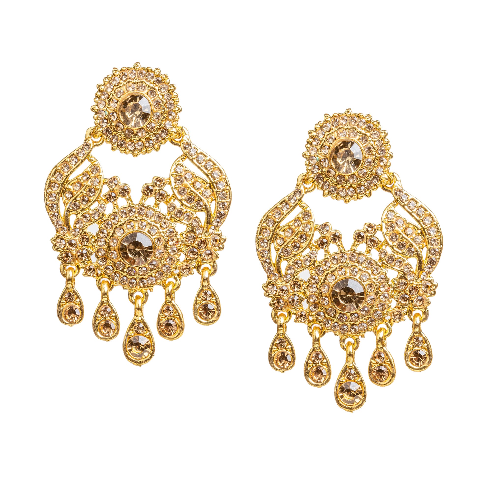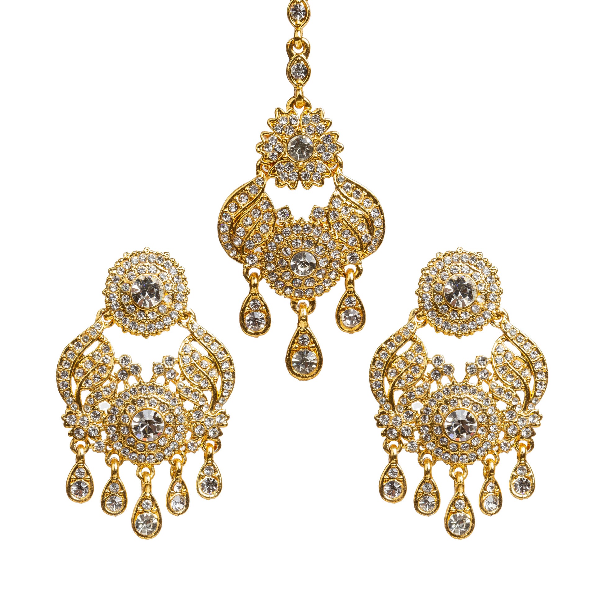 "Bindhani's bridal chandelier maang tikka and earrings set, adorned with dazzling stone drops. Choose from gold-plated options with white or golden stones, or a silver-plated set with white stones. These lightweight, traditional designs are expertly crafted in India, promising top-tier quality in every piece."