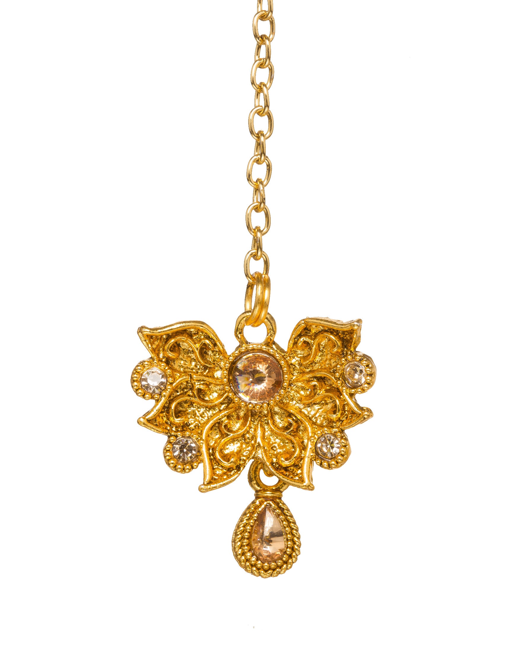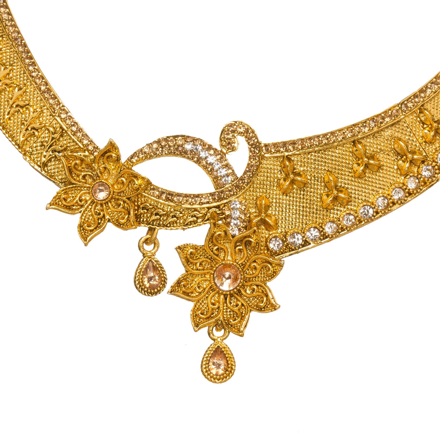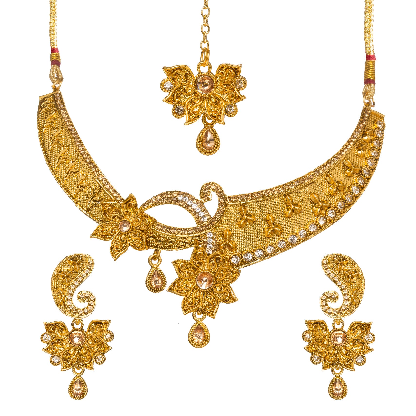 Indian customers have a preference for various necklace styles, including simple pearl necklace malas, choker necklaces with earrings, and complete jewelry sets comprising earrings, necklaces, and mangtikkas. In Hindi, a necklace set is also referred to as "gale ka necklace," and in Rajasthan, Rakhdi sets are popular, especially with Rajputi dresses. Additionally, multilayered Rani Haar or Haram, Jaipuri Kundan necklaces with Jhumka sets, and in certain regions, chokers are known as Haslis. South Indian customers often favor multilayered temple necklace sets. For bridal wear, a complete packet of Dulhan sets is