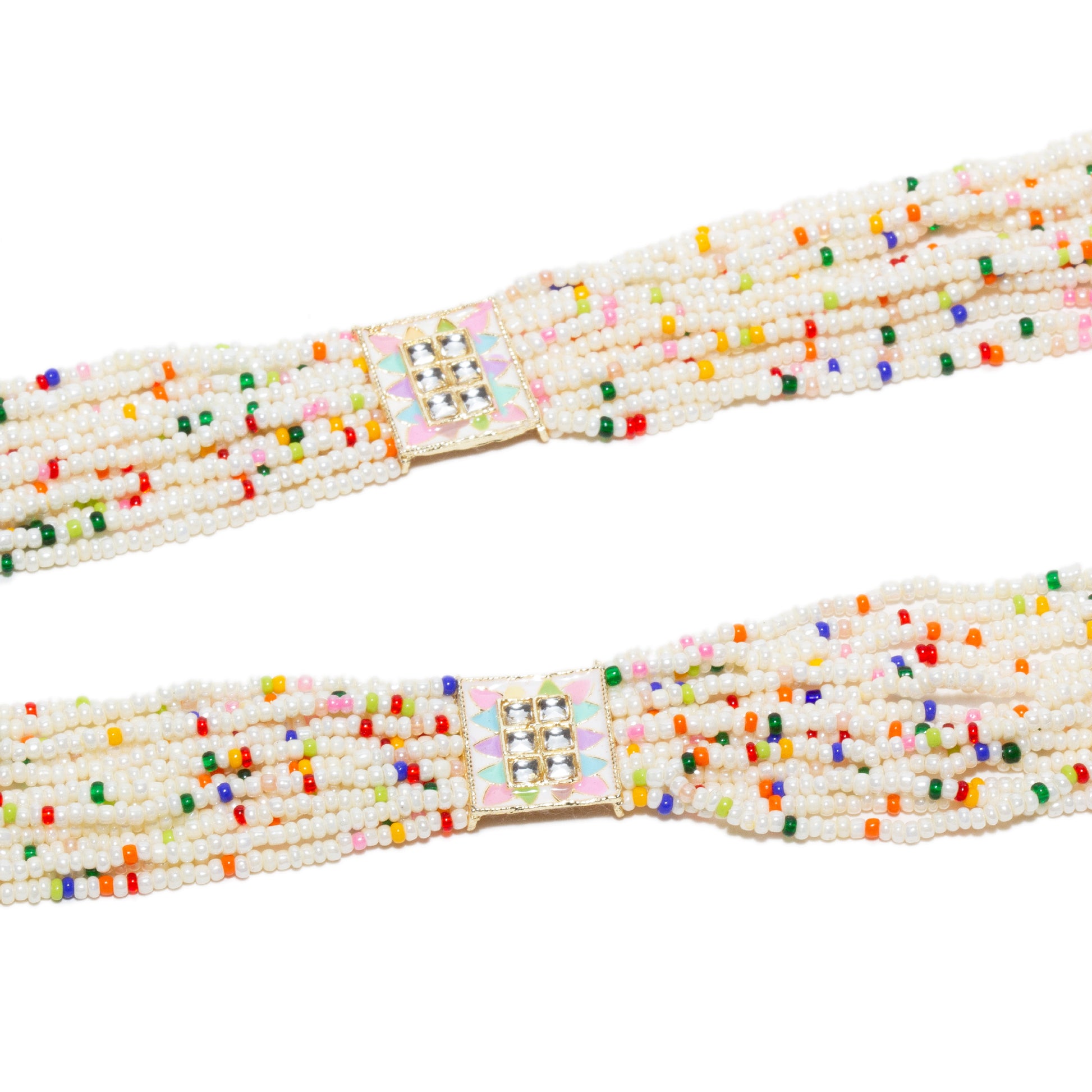 Upgrade your jewelry collection with the elegant and luxurious Patwa Set Long Rani Haar from house of Bindhani. Made with high-quality pearls and a beautifully designed rectangle pendant, this set is perfect for any special occasion. The intricate craftsmanship,hand painted pastel meenakari and boldness of multi color beads make it statement accessory, pairs with matching earrings for complete look,