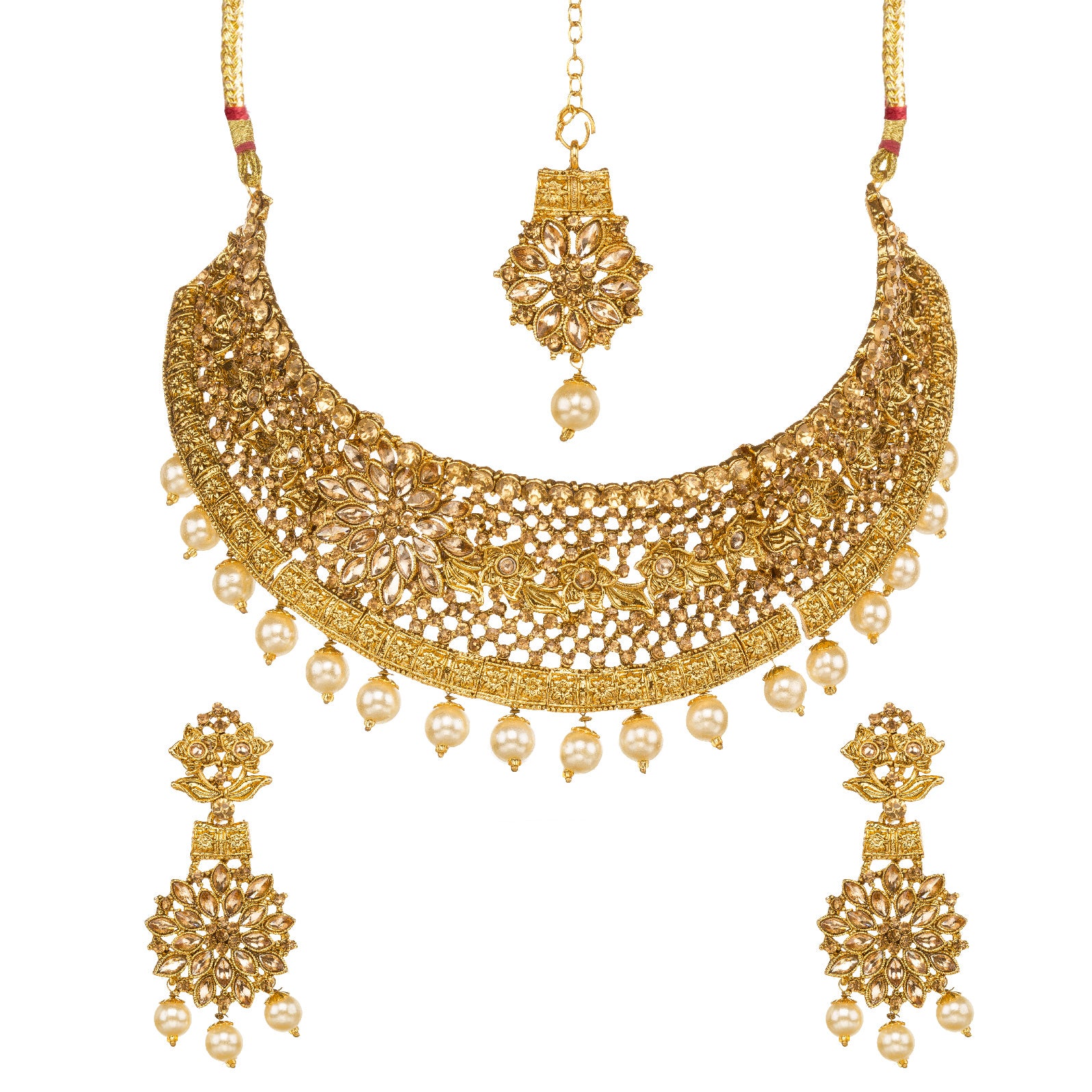 Indian customers have a preference for various necklace styles, including simple pearl necklace malas, choker necklaces with earrings, and complete jewelry sets comprising earrings, necklaces, and mangtikkas. In Hindi, a necklace set is also referred to as "gale ka necklace," and in Rajasthan, Rakhdi sets are popular, especially with Rajputi dresses. Additionally, multilayered Rani Haar or Haram, Jaipuri Kundan necklaces with Jhumka sets, and in certain regions, chokers are known as Haslis. South Indian customers often favor multilayered temple necklace sets. For bridal wear, a complete packet of Dulhan sets is