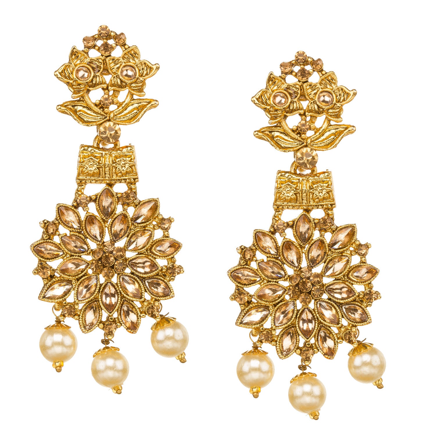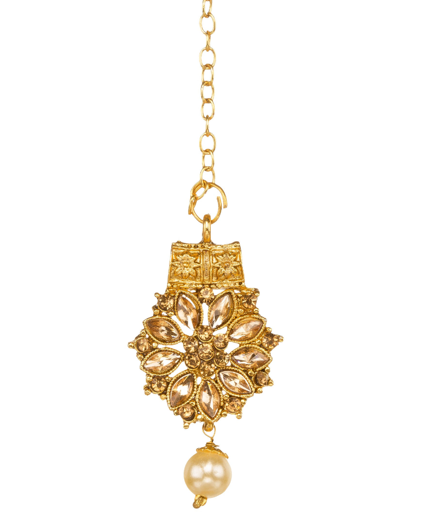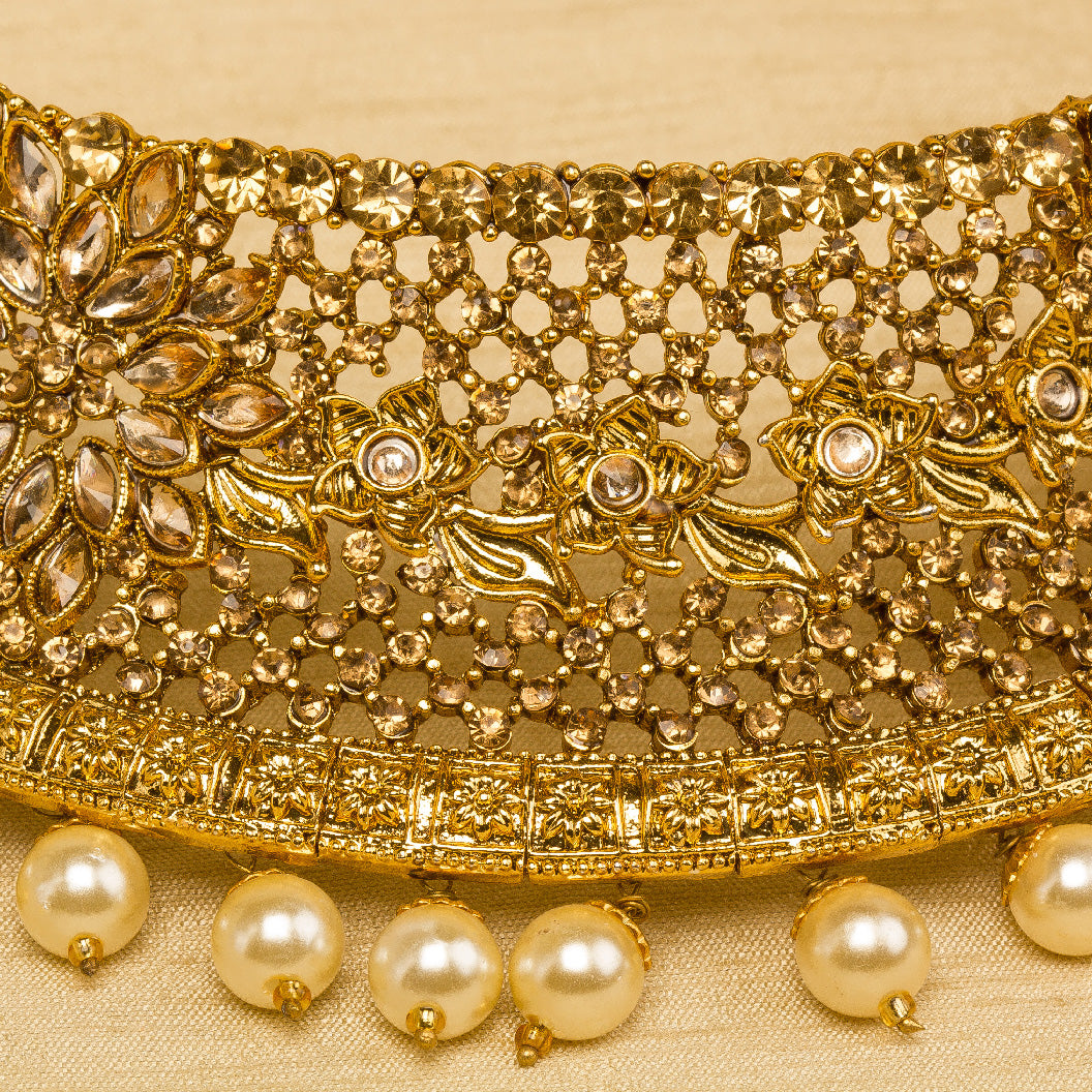 Bindhani choker necklace set, with round earrings & maang tikka, featuring golden brown stones and pearl drops, a gold-plated, lightweight design with flower details. Handmade in India, it's perfect for weddings or pooja. Pairs beautifully with traditional Indian attire like sarees or Anarkali suits for an elegant look.