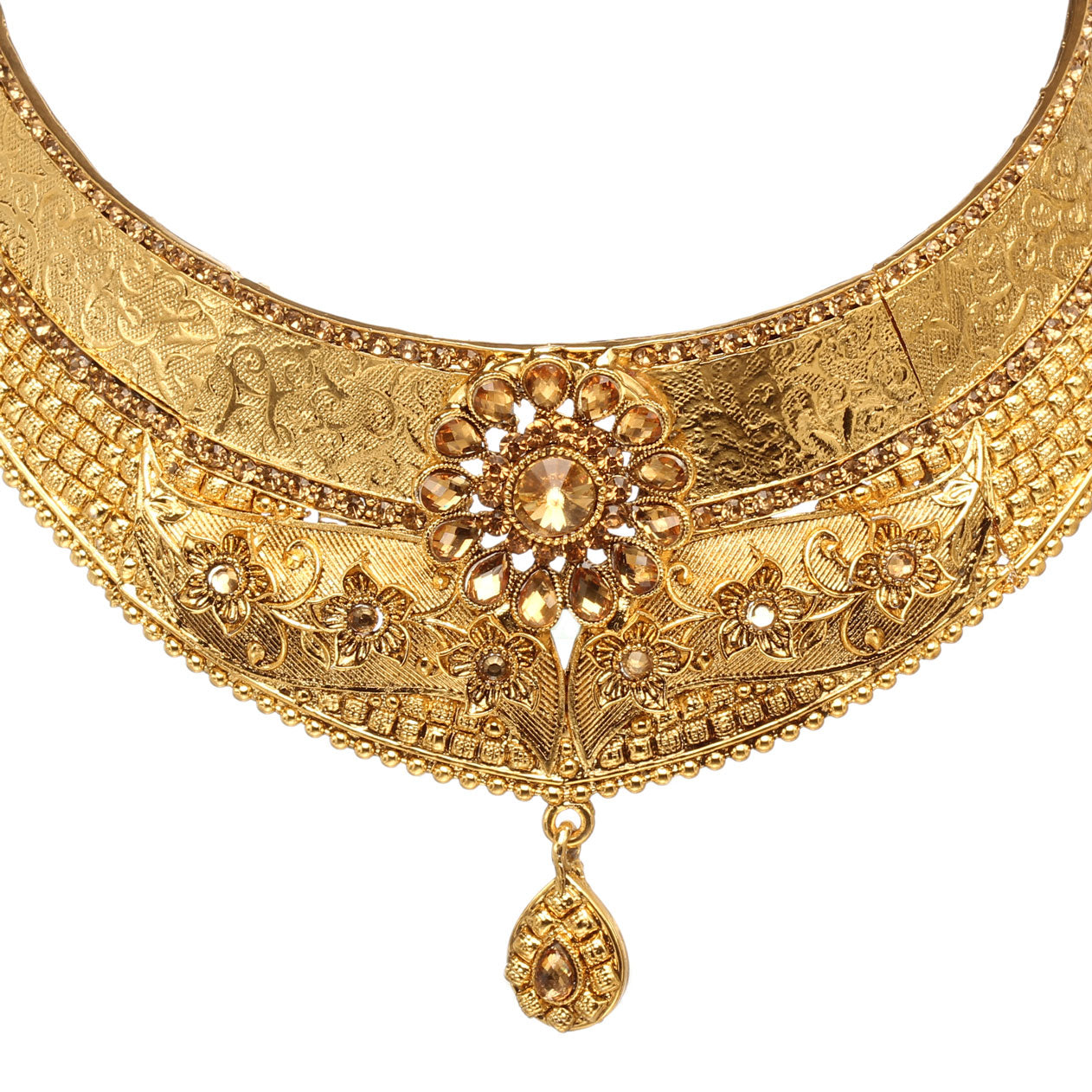 Bindhani's gold-plated choker set, accompanied by matching earrings & maang tikka, features golden kundan stones in a floral pattern. Medium-sized and lightweight, this snug-fitting necklace elegantly graces the neck. Perfect for enhancing your traditional attire.