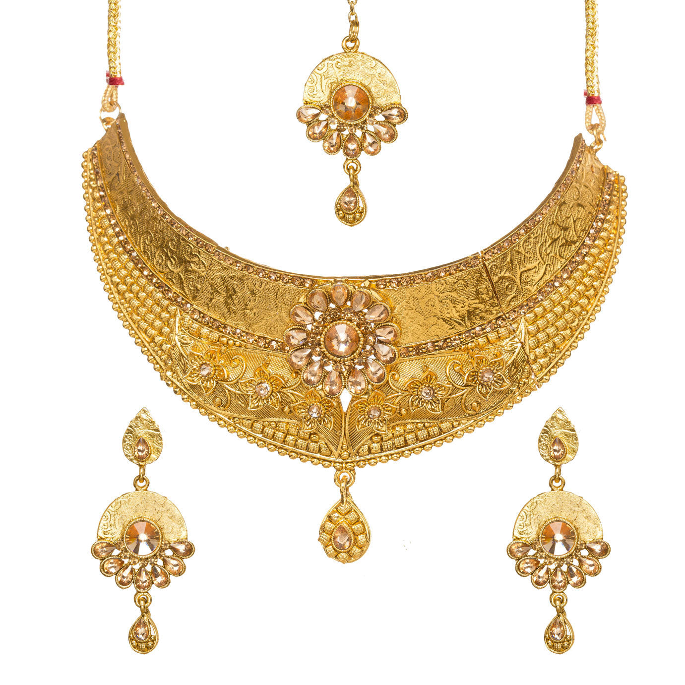 Indian customers have a preference for various necklace styles, including simple pearl necklace malas, choker necklaces with earrings, and complete jewelry sets comprising earrings, necklaces, and mangtikkas. In Hindi, a necklace set is also referred to as "gale ka necklace," and in Rajasthan, Rakhdi sets are popular, especially with Rajputi dresses. Additionally, multilayered Rani Haar or Haram, Jaipuri Kundan necklaces with Jhumka sets, and in certain regions, chokers are known as Haslis. South Indian customers often favor multilayered temple necklace sets. For bridal wear, a complete packet of Dulhan sets is