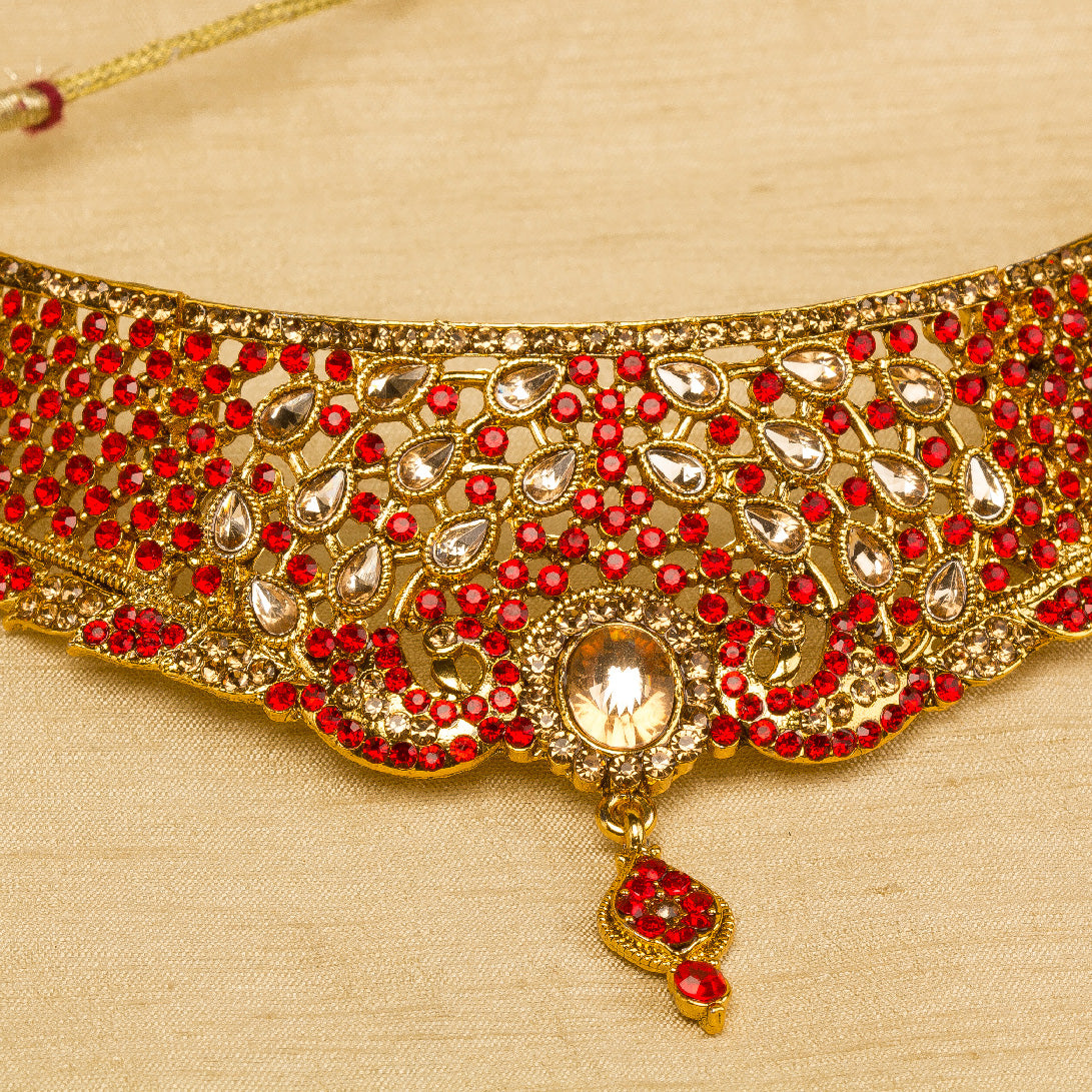 Indian customers have a preference for various necklace styles, including simple pearl necklace malas, choker necklaces with earrings, and complete jewelry sets comprising earrings, necklaces, and mangtikkas. In Hindi, a necklace set is also referred to as "gale ka necklace," and in Rajasthan, Rakhdi sets are popular, especially with Rajputi dresses. Additionally, multilayered Rani Haar or Haram, Jaipuri Kundan necklaces with Jhumka sets, and in certain regions, chokers are known as Haslis. South Indian customers often favor multilayered temple necklace sets. For bridal wear, a complete packet of Dulhan sets is