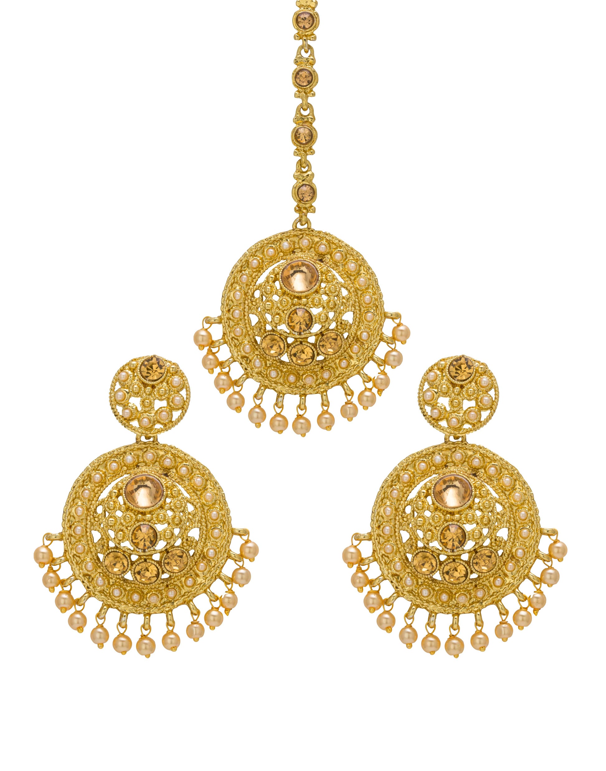 "Complete your bridal look with Bindhani's gold-plated maang tikka and earrings, adorned with golden stones and multiple pearl drops. Lightweight and handcrafted in India, it's the perfect accessory to a red lehenga or a Kanjeevaram saree. For an elegant bridal look, pair with a matching neckpiece and bangles. An epitome of Indian bridal charm."