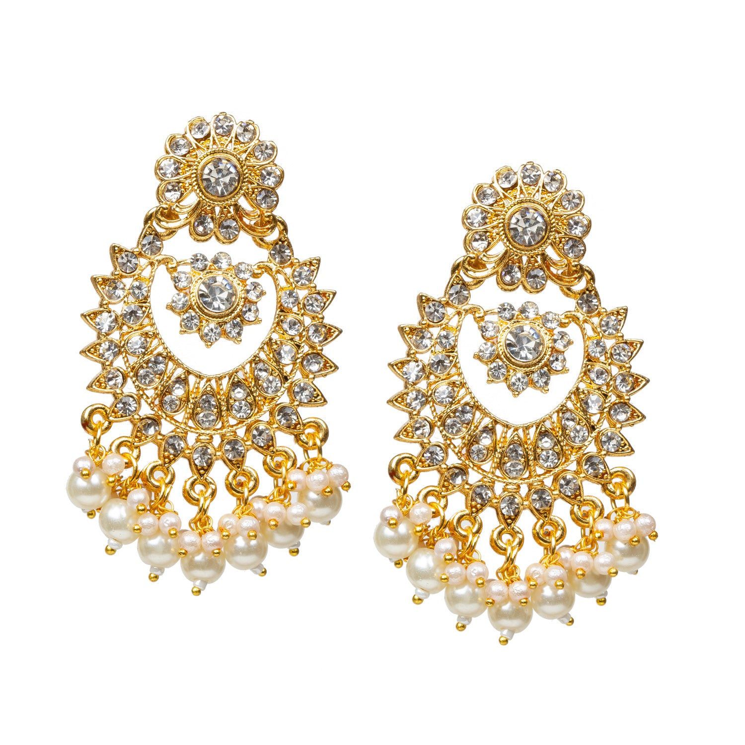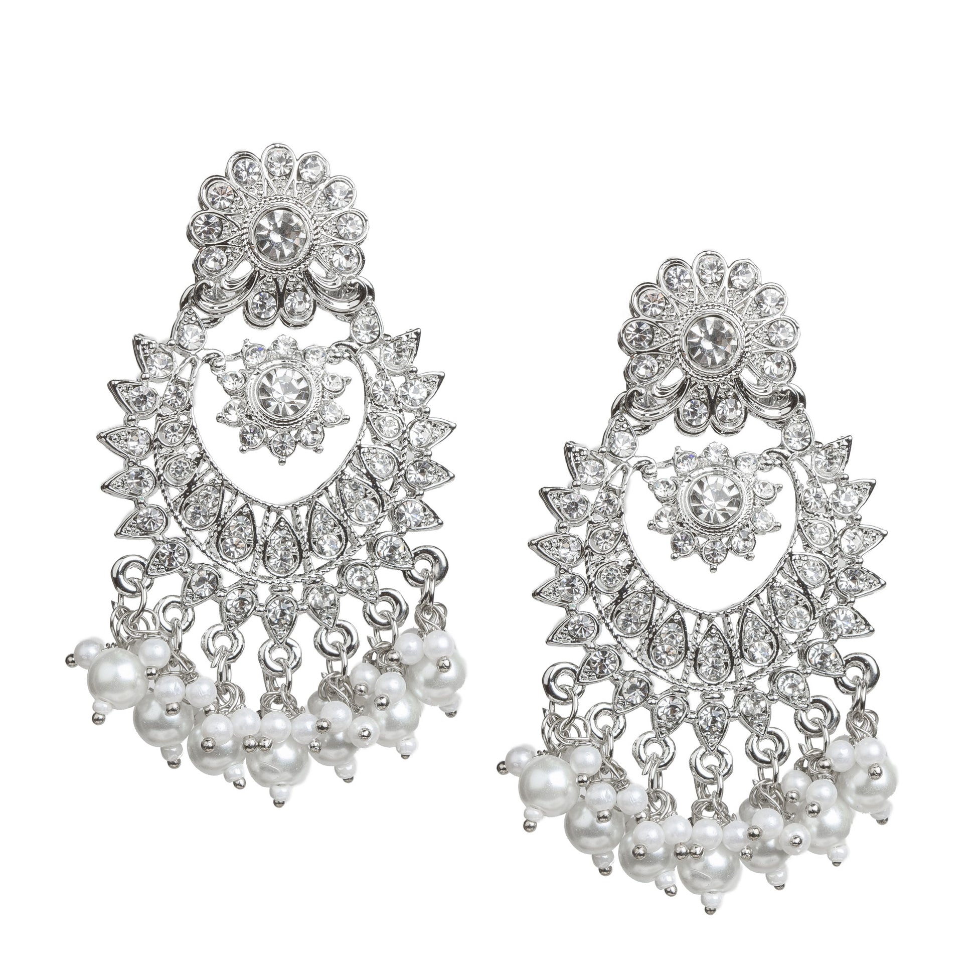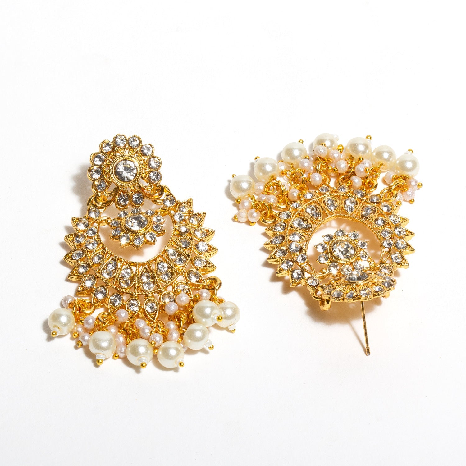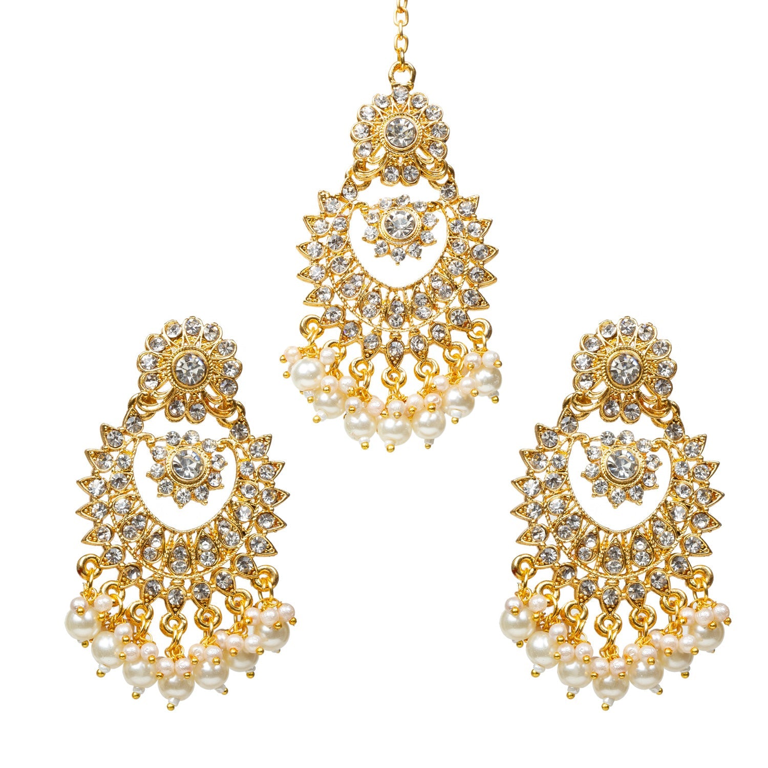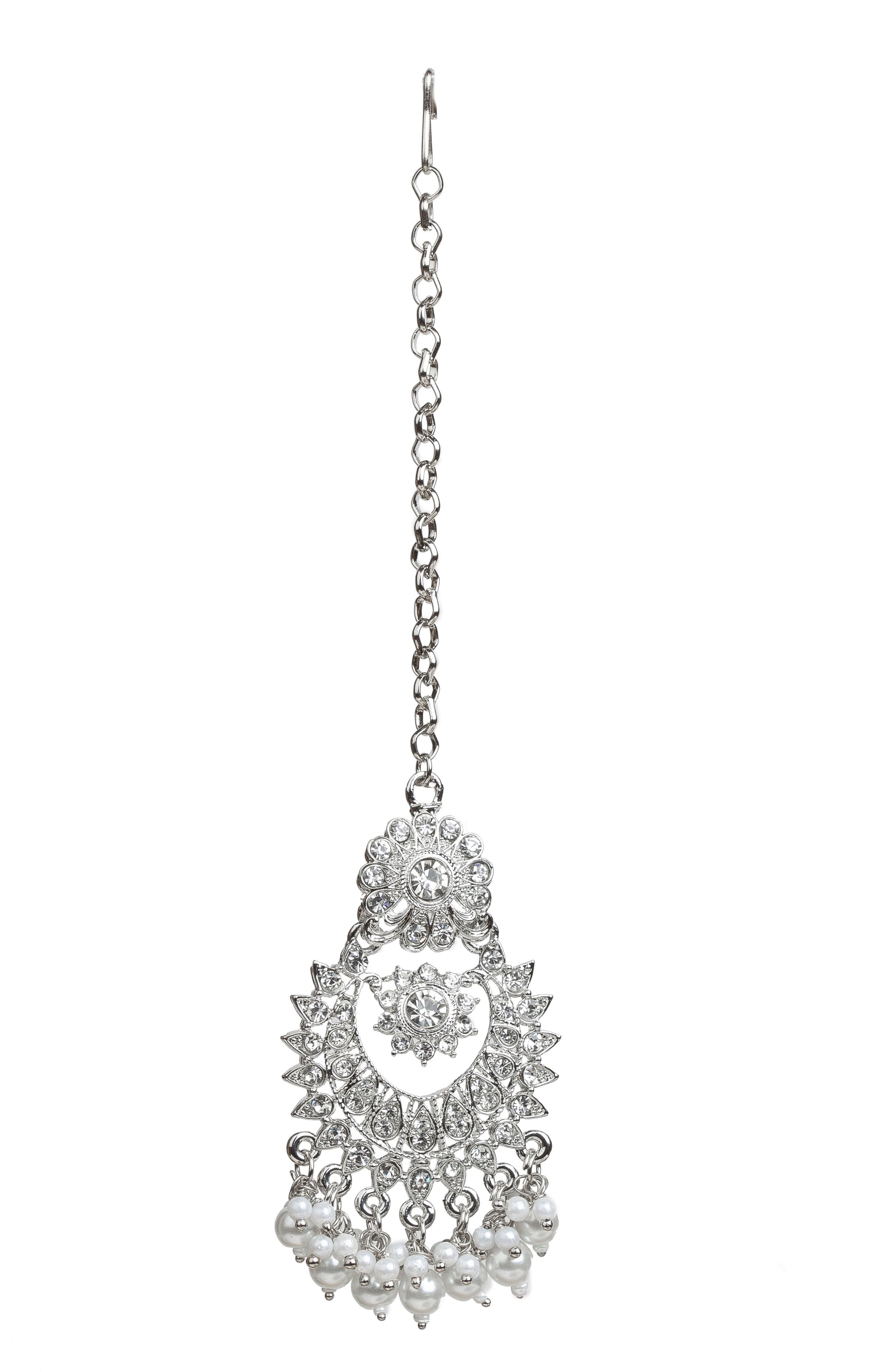 "Elevate your style with Bindhani's silver-plated maang tikka and earrings, decorated with sparkling white stones and pearl drops. The moon-shaped cutting in the center adds a unique touch. Lightweight and perfect with a white gown for receptions, sangeet, weddings, or parties. Expertly crafted in India, promising quality and satisfaction."