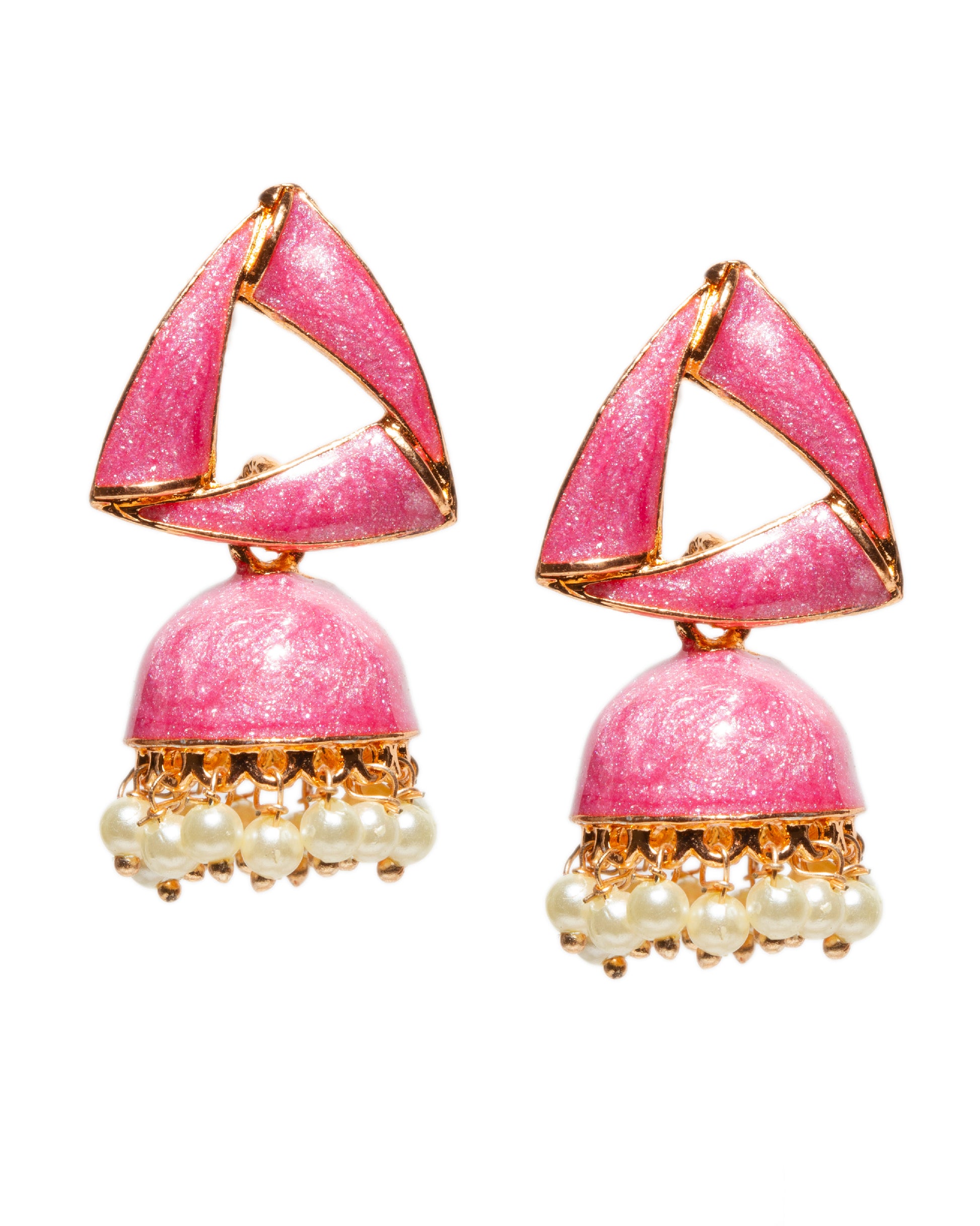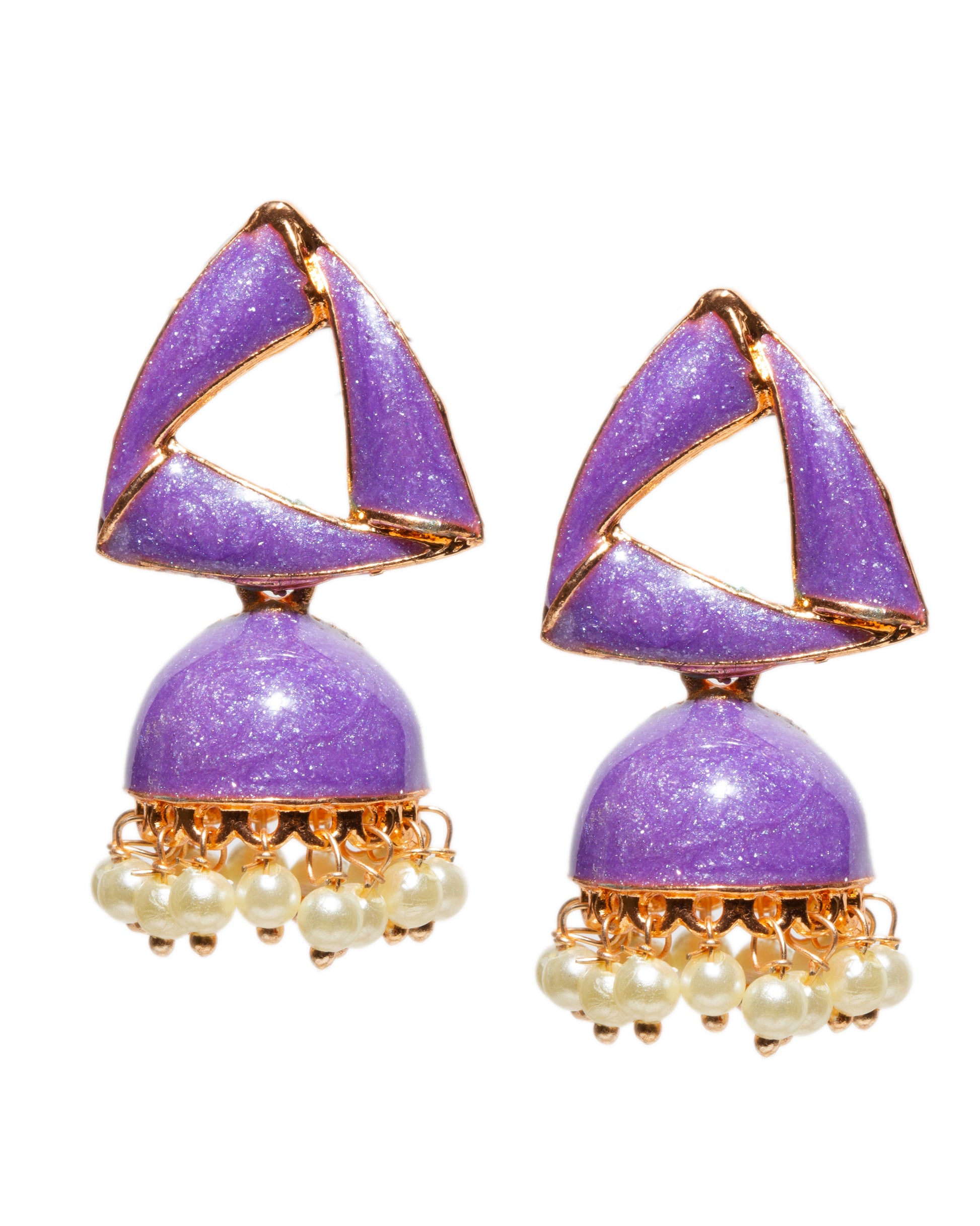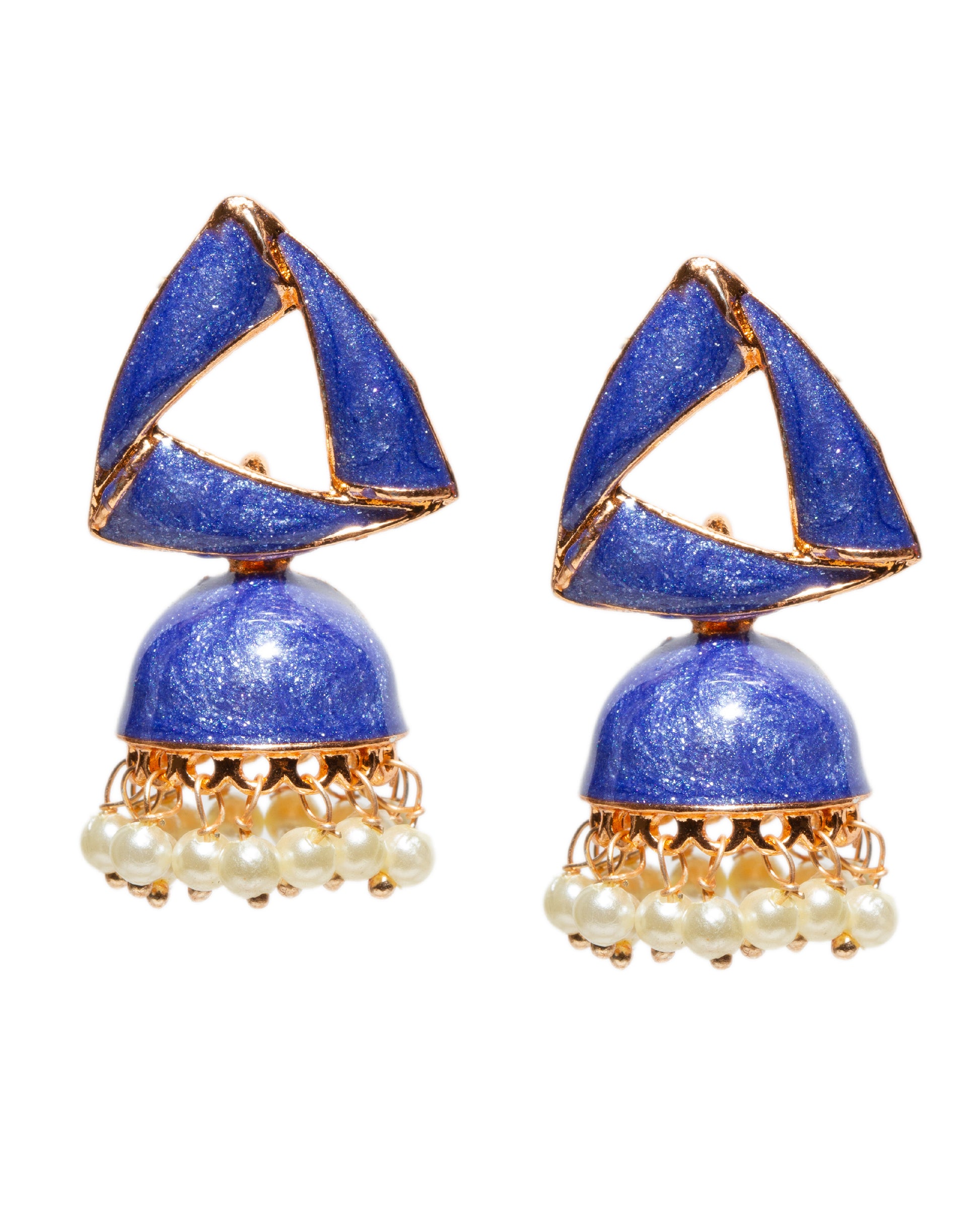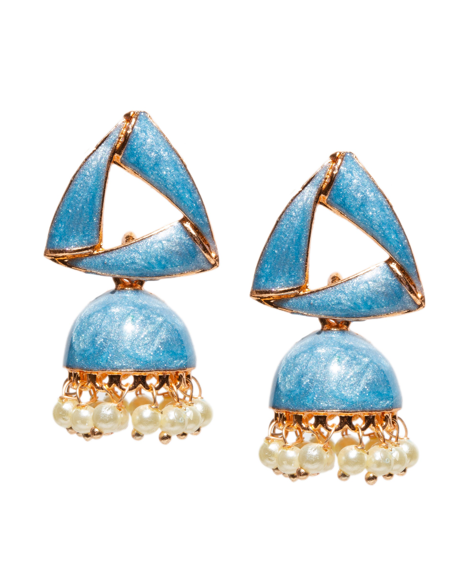 Make a statement with our Small Meenakari Earrings. Hand-painted with high-quality nail polish finished, the meena design has a unique wave-like texture that will catch any eye. Crafted from alloy metal and detailed with small hanging pearl beads, these triangular shaped earrings are perfect for both college and office wear.