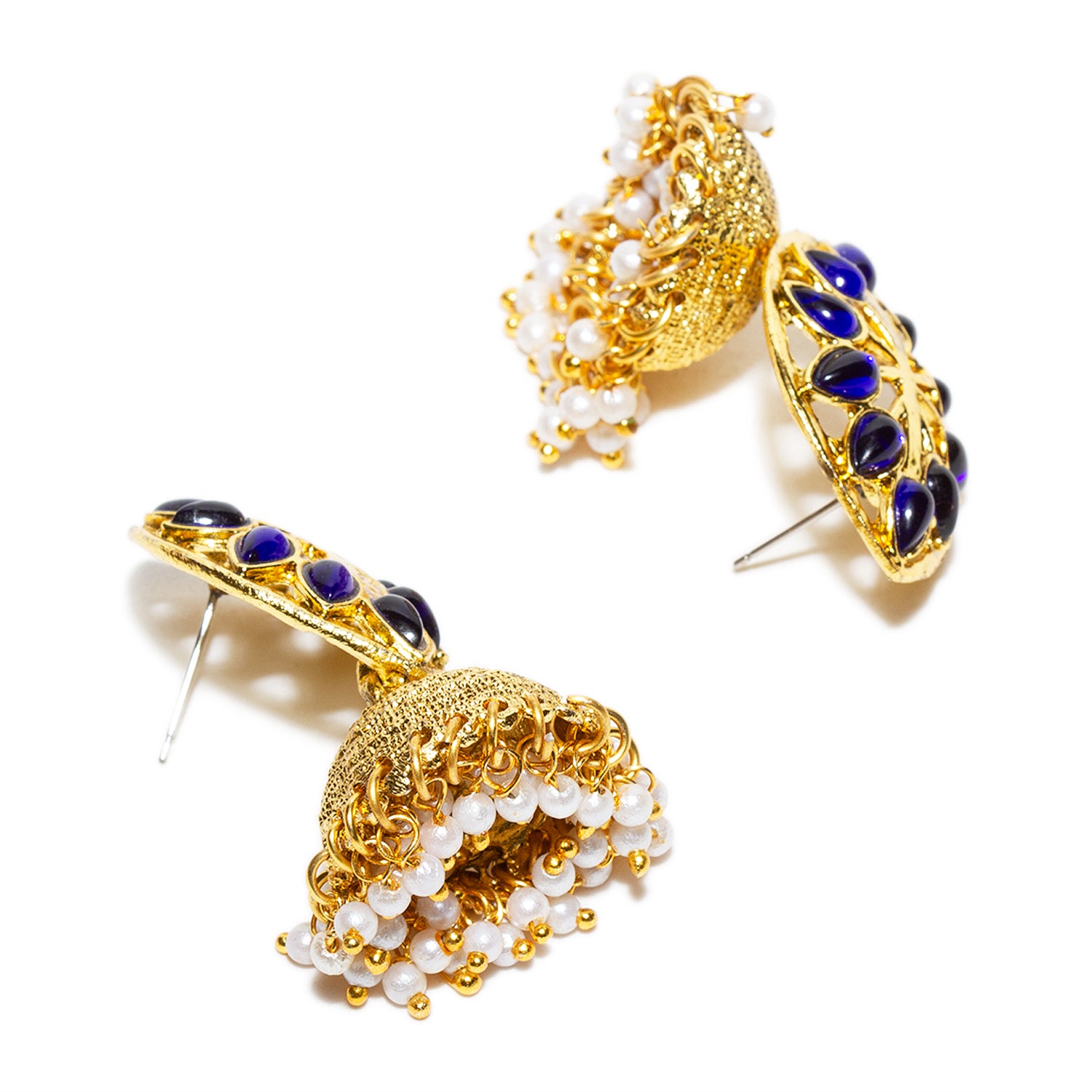 Elevate your style with Bindhani's women's traditional big gold-plated jhumka earrings. Adorned with pearls, drop beads, and available in red and royal blue stone colors. Handcrafted with care, excellent quality, and lightweight. Perfect for weddings, bridal wear, and special occasions. Secure push-back closure and budget-friendly price.