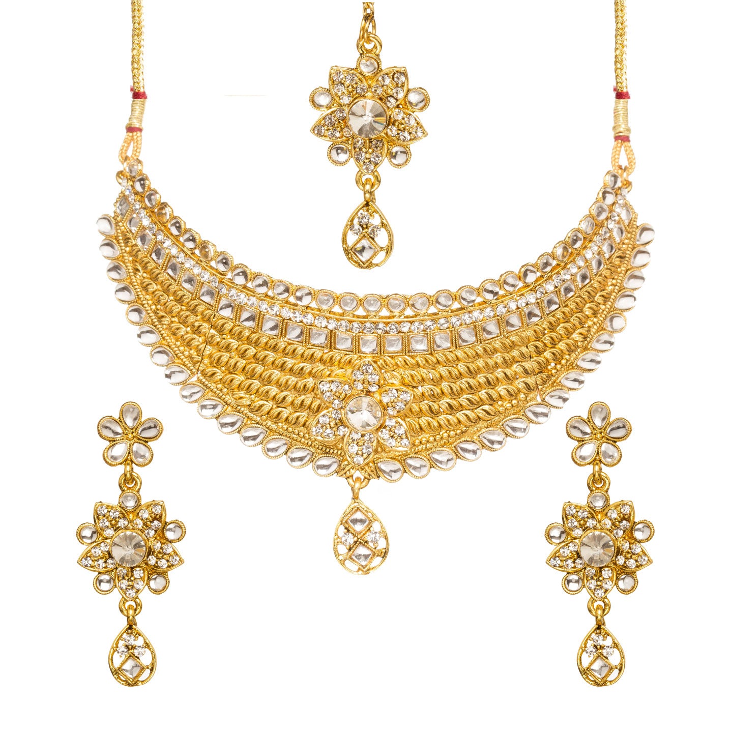 Indian customers have a preference for various necklace styles, including simple pearl necklace malas, choker necklaces with earrings, and complete jewelry sets comprising earrings, necklaces, and mangtikkas. In Hindi, a necklace set is also referred to as "gale ka necklace," and in Rajasthan, Rakhdi sets are popular, especially with Rajputi dresses. Additionally, multilayered Rani Haar or Haram, Jaipuri Kundan necklaces with Jhumka sets, and in certain regions, chokers are known as Haslis. South Indian customers often favor multilayered temple necklace sets. For bridal wear, a complete packet of Dulhan sets is